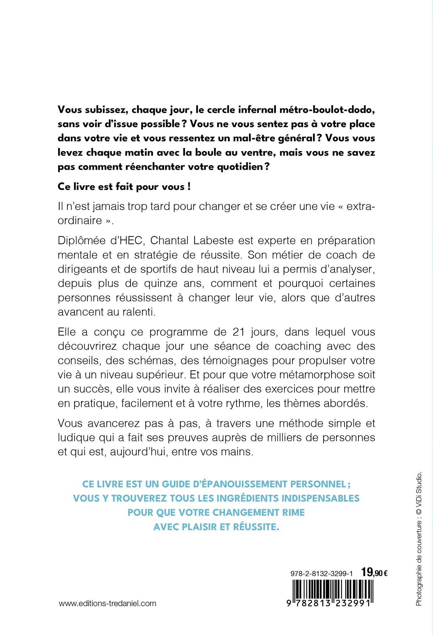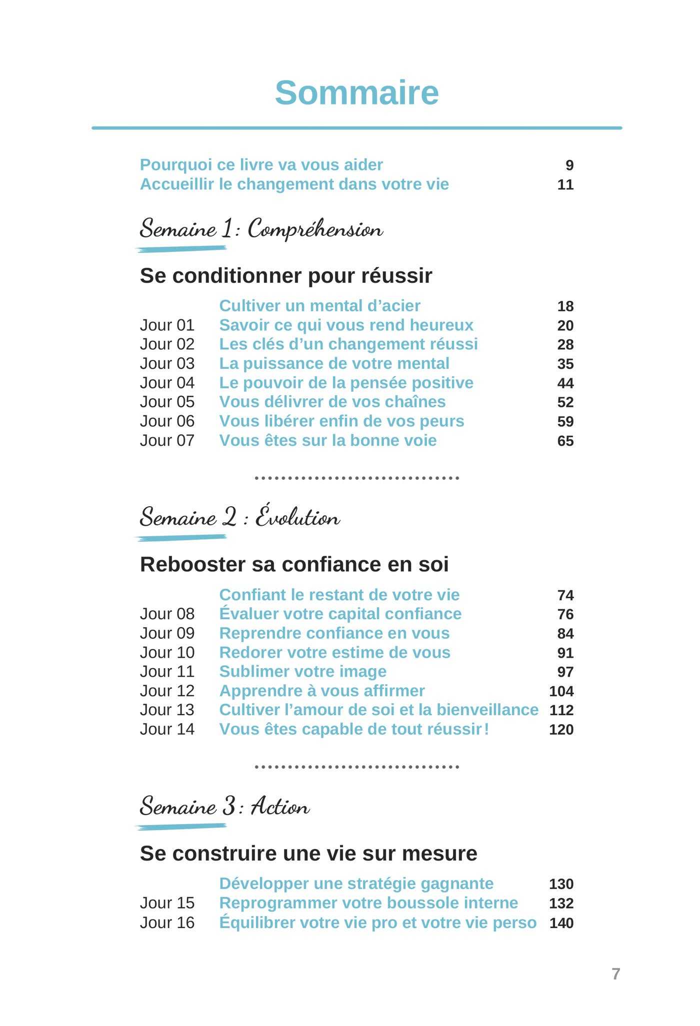 Elle a conçu ce programme de 21 jours, dans lequel vous découvrirez chaque jour une séance de coaching avec des conseils, des schémas, des témoignages pour propulser votre vie à un niveau supérieur. Et pour que votre métamorphose soit un succès, elle vous invite à réaliser des exercices pour mettre en pratique, facilement et à votre rythme, les thèmes abordés.