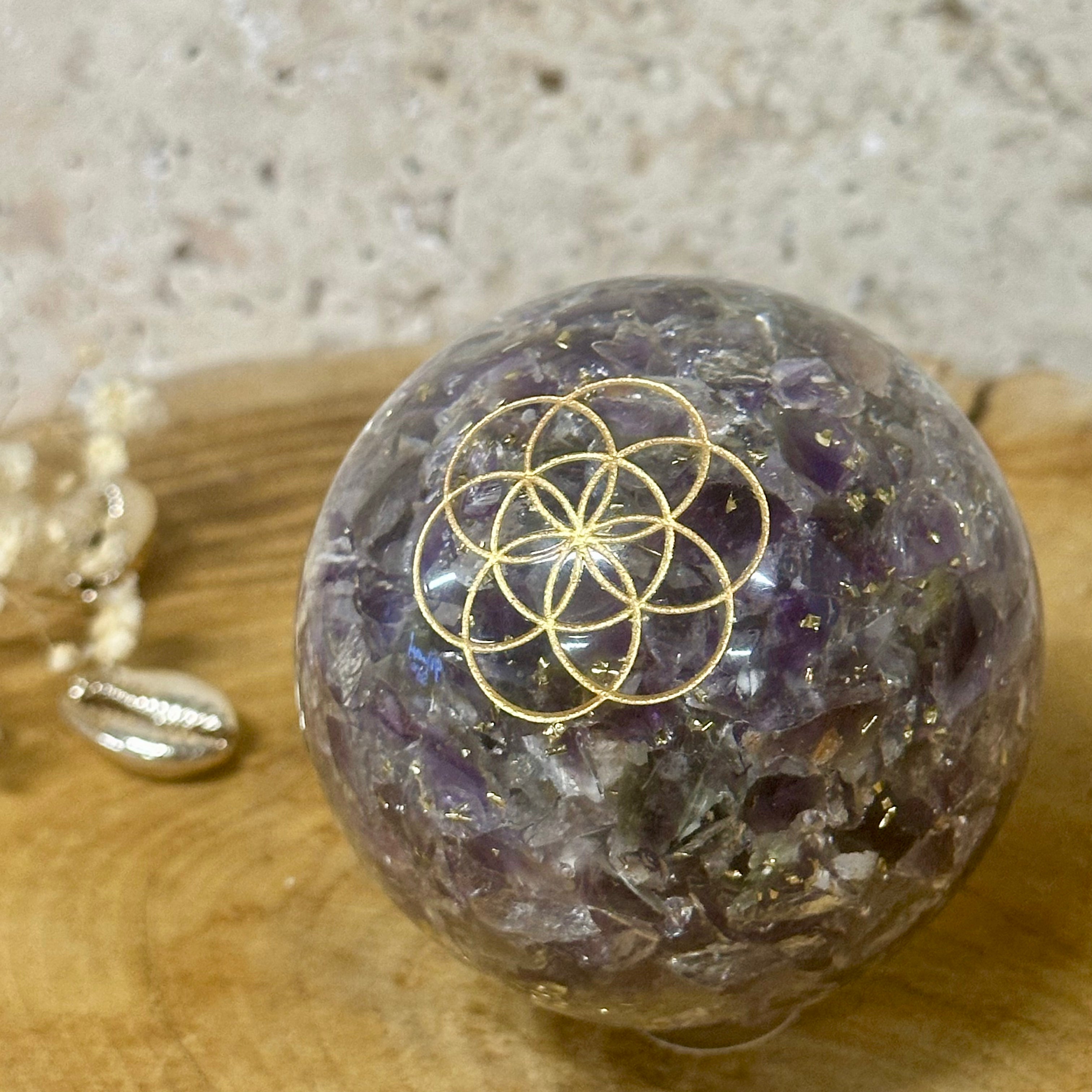 Orgonite sphère améthyste avec Fleur de Vie