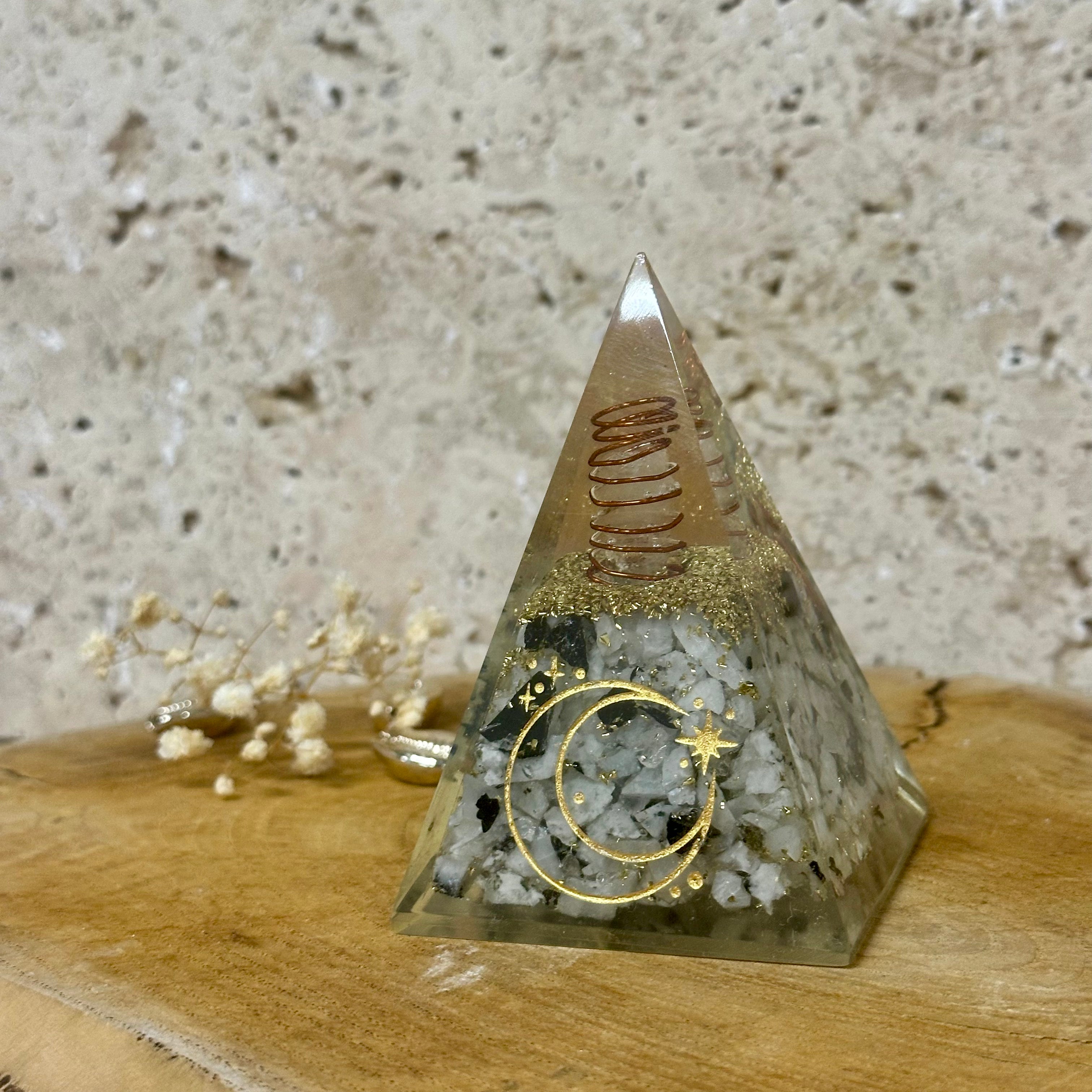Pyramide orgonite en pierre de lune avec symbole de la lune